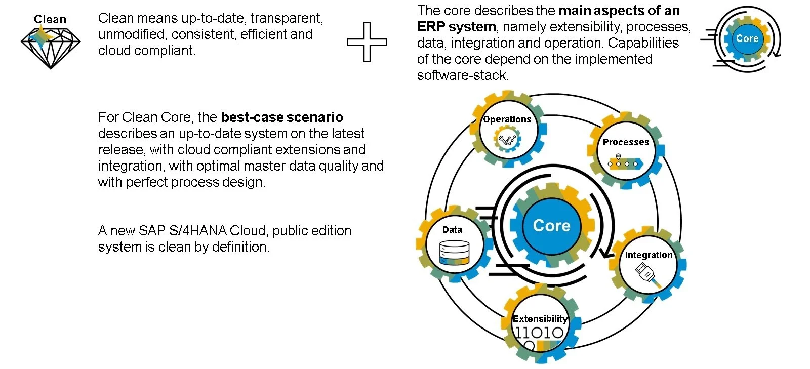 Dit is een ERP-systeem waarbij de core (de kern van de software) geen maatwerk bevat, we hebben het dan over een standaard ERP-systeem. Clean core gaat over de volgende assen: