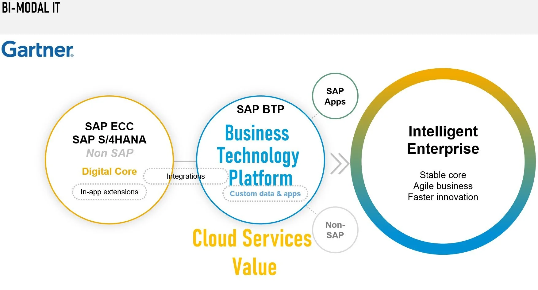 Om deze uitdaging aan te gaan, was het noodzakelijk het klassieke concept extensies duurzaam aan te passen aan moderne bedrijfsmodellen. SAP heeft hiervoor het model van Gartner gebruikt, dit model staat bekend als het Bi-Modal IT. Dit model geeft organisaties richting aan hun digitale transformatie.